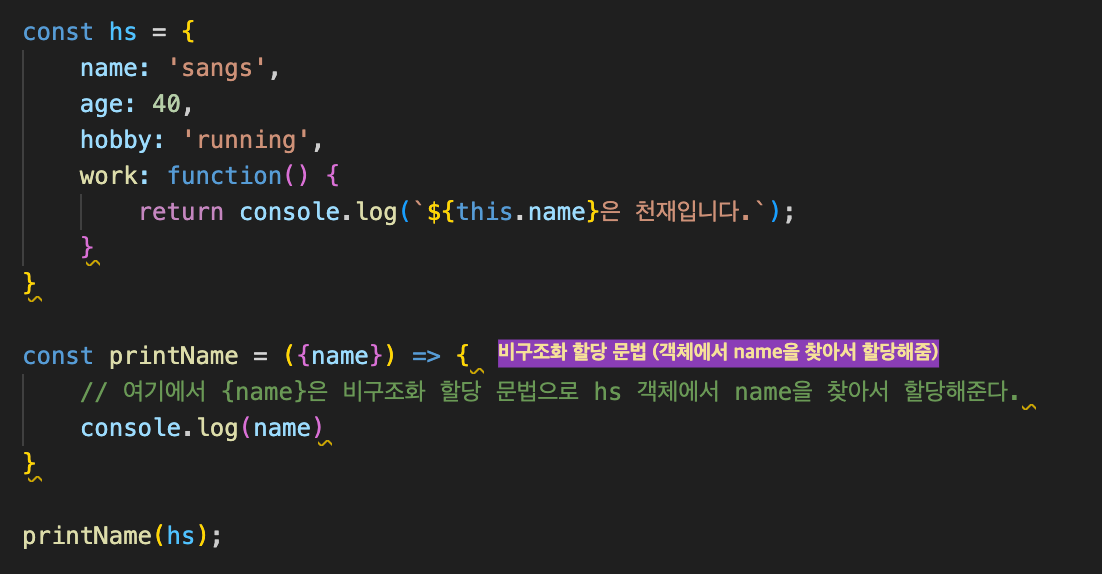 {} 를 활용하면 객체의 특정 키값을 찾아서 할당해준다. name, age, hobby 등