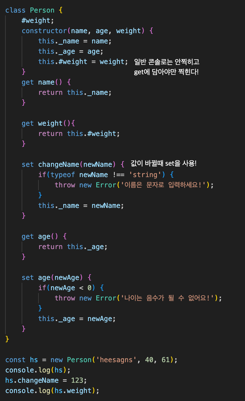 위 코드에서 몸무게는 출력되지 않는다. #을써서 private속성을 줬기 때문인데