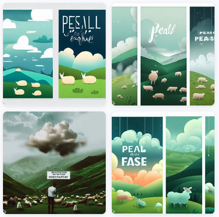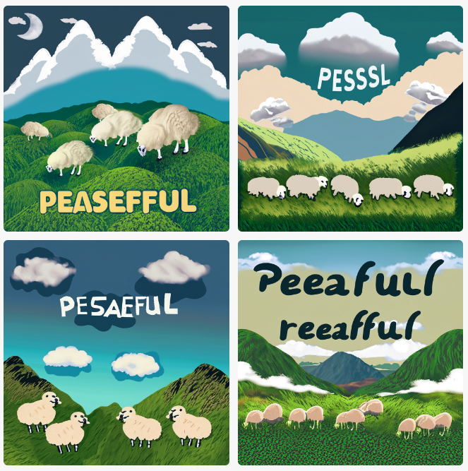 상대적으로 깔끔하고 완성도 있는 형태의 포스터 | peaceful 이라는 단어가 없음. (문자를 그리지 못함) |